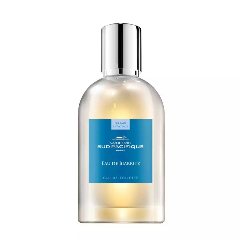 EAU DE TOILETTE. Eau de Biarritz di Comptoir Sud Pacifique è una brezza stimolante che ci porta dalla costa l'odore fresco e iodato dell'alga bruna, colorata da note fiorite, dal sandalo delle indie, del benzoino del siam, per un`atmosfera di vacanze movimentate