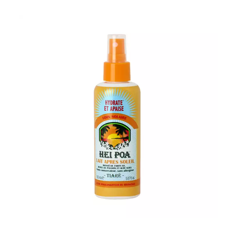 Lait apres solei di Hei Poa è un latte doposole che idrata la pelle e lenisce l'arrossamento, grazie al monoi di Tahiti, all'aloe vera e al frutto della passione. Rinfresca grazie ad un principio attivo "effetto freddo" e prolunga l'abbronzatura