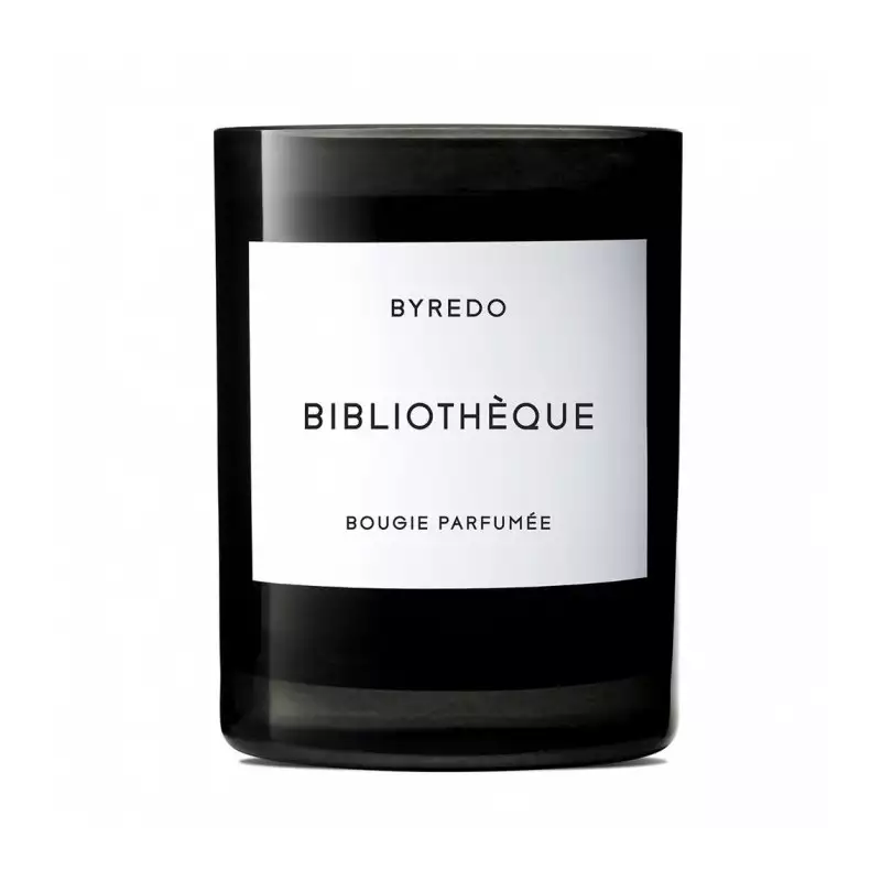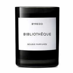 BIBLIOTHEQUE di BYREDO: candela con note di cuoio, pesca, vaniglia.