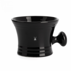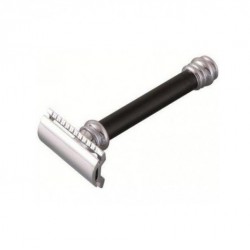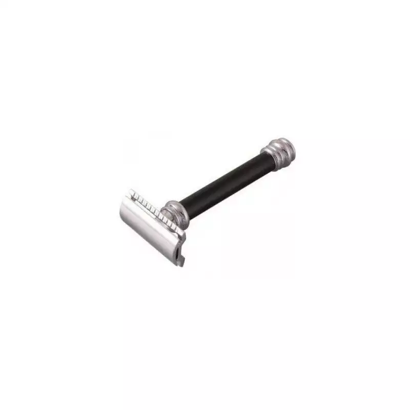 Rasoio di sicurezza della Merkur di Solingen realizzato in acciaio cromato, manico nero, taglio dritto.