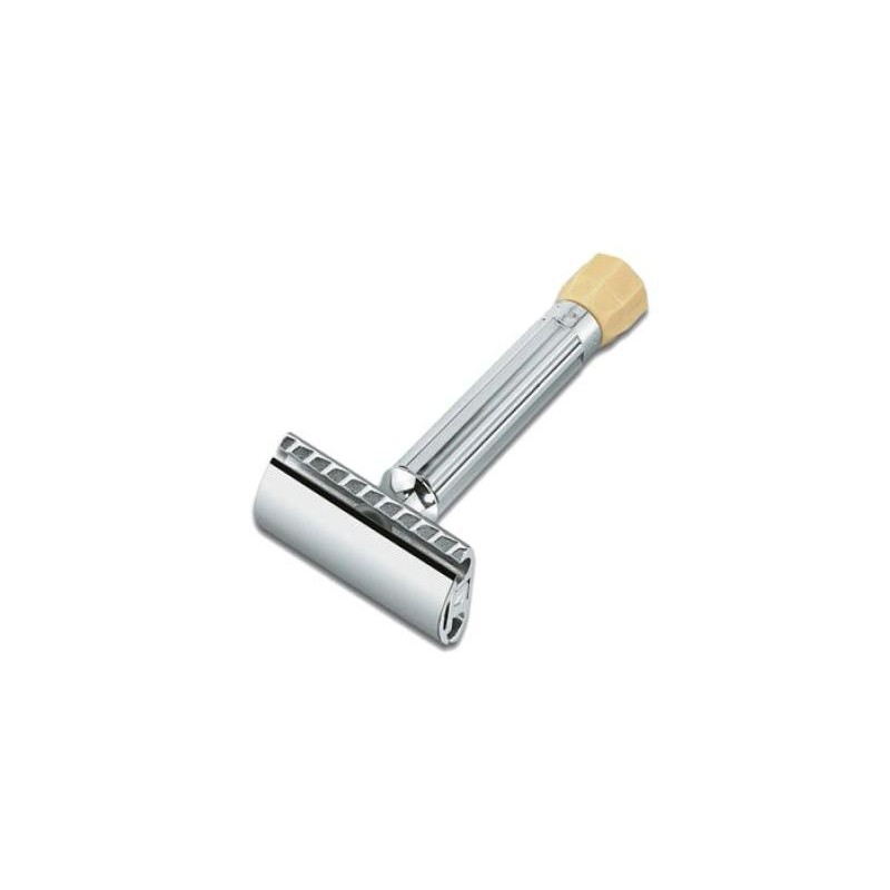 Rasoio da barba per lametta tradizionale della ditta tedesca Merkur. Ha un sistema di regolazione che consente di variare le inclinazioni della lametta e garantire così una rasatura perfetta. Lunghezza: 8,9 cm