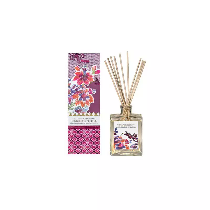 DIFFUSORE AMBIENTE. Una linea di diffusori per ambiente ispirata a "Le Jardin di Fragonard" dal design colorato, allegro. Gingembre-Vetiver è un flacone con 10 bastoncini in legno che profuma delicatamente ogni stanza.
