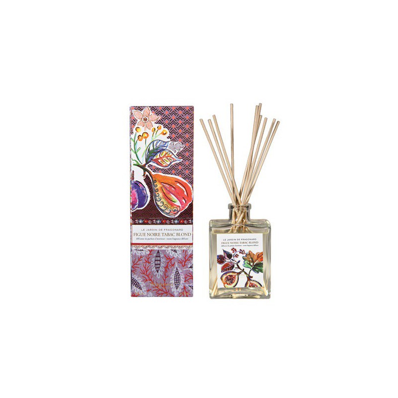 DIFFUSORE AMBIENTE. Una linea di diffusori per ambiente ispirata a "Le Jardin di Fragonard" dal design colorato, allegro. Figue Noir-Tabac Blond è un flacone con 10 bastoncini in legno che profuma delicatamente ogni stanza.