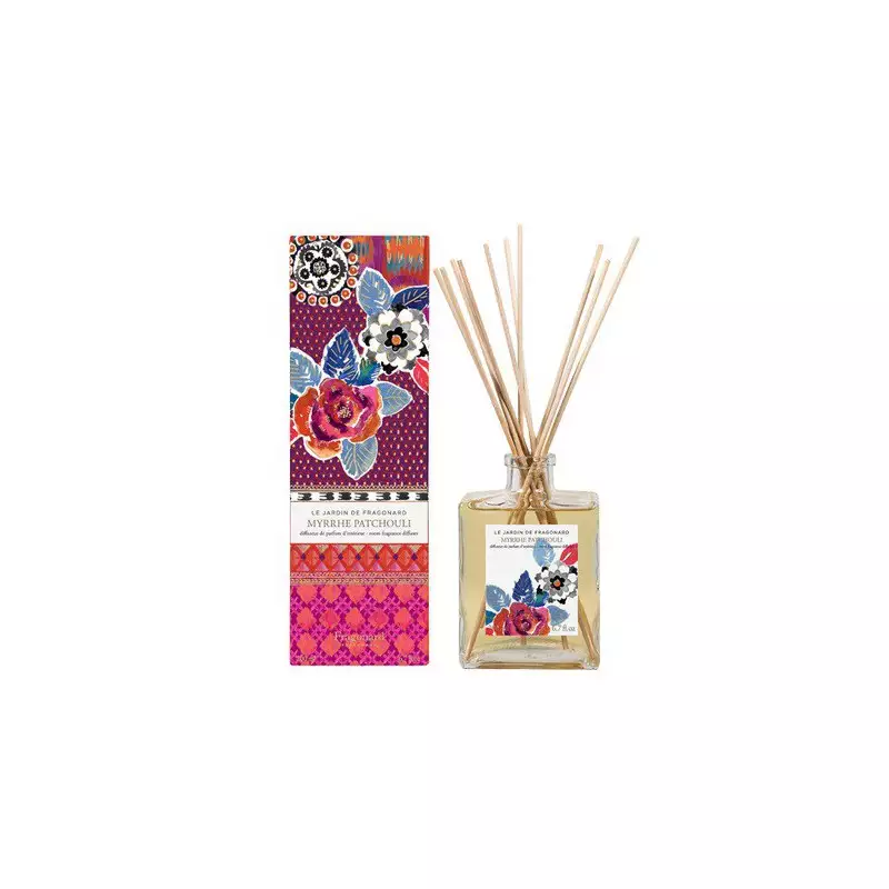 DIFFUSORE AMBIENTE. Una linea di diffusori per ambiente ispirata a "Le Jardin di Fragonard" dal design colorato, allegro. Myrrhe-Patchouli è un flacone con 10 bastoncini in legno che profuma delicatamente ogni stanza.