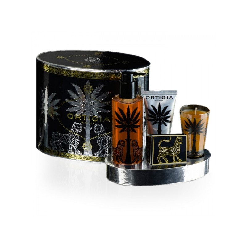 Il regalo ideale: Ambra Nera di Ortigia in scatole argentate colorate; lo stile italiano incontra la storia e la magia della Sicilia. Bagno schiuma 200ml, Candela cono, Sapone singolo 40g, Crema mani 75ml