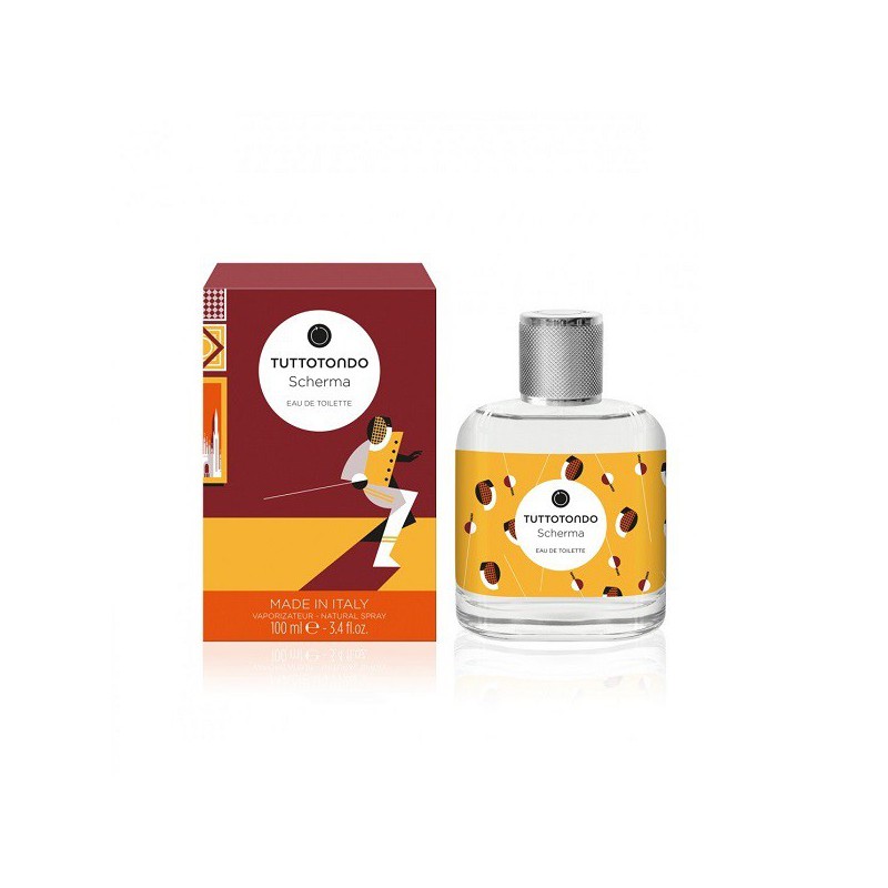 EAU DE TOILETTE. Scherma di Tuttotondo è una fragranza maschile dalle note calde e avvolgenti. Un mix di spezie come lo zafferano e la noce moscata si incontrano con il geranio e accordi di legni e pelle. Un profumo elegante e misterioso, proprio come uno schermitore che avanza nel suo ultimo gesto della stoccata vincente.