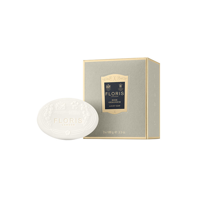 SAPONI PROFUMATI. Prodotti secondo metodi tradizionali, i saponi Rose Geranium, color avorio e con impresso il marchio Floris, sono raffinati tre volte ed hanno una consistenza al tatto molto particolare. Più volte un sapone è raffinato, più risulta duraturo e la fragranza vi può essere dispersa meglio e più uniformemente, garantendone la persistenza fino all’ultima scaglia. I condizionanti della pelle e la glicerina conferiranno morbidezza ed elasticità alla pelle, la farina d’avena avrà effetto lenitivo mentre l’elevato contenuto di fragranza la lascerà piacevolmente profumata. I saponi dalla classica forma ovale sono incartati a mano per assicurare la miglior protezione fino all’utilizzatore finale.
