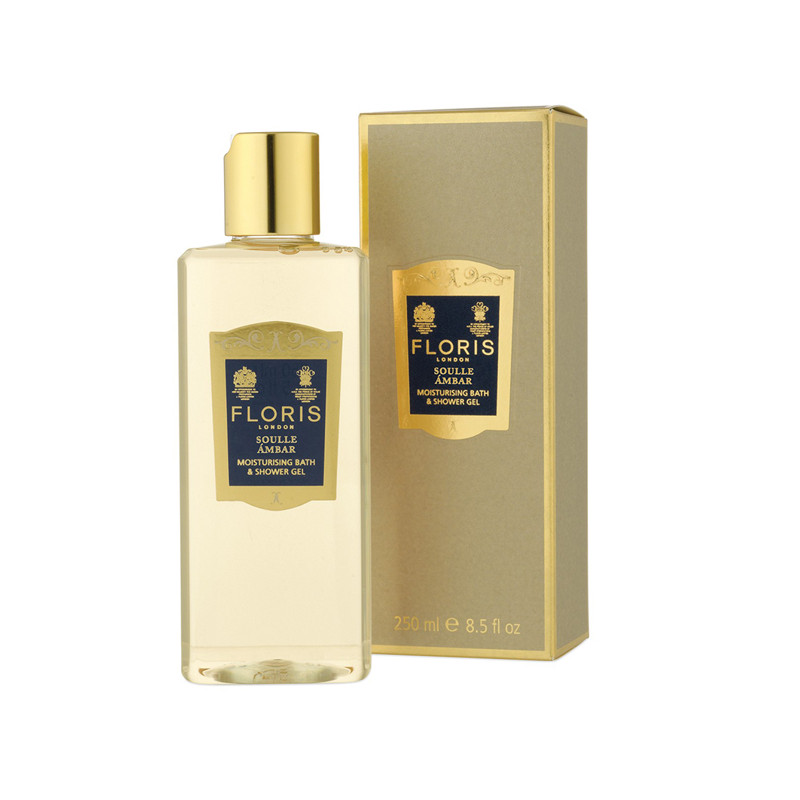 BAGNOSCHIUMA. Soulle Ambar shower gel 250 ml Floris London, è un doccia schiuma a base di olio di oliva che mantiene la pelle idratata.