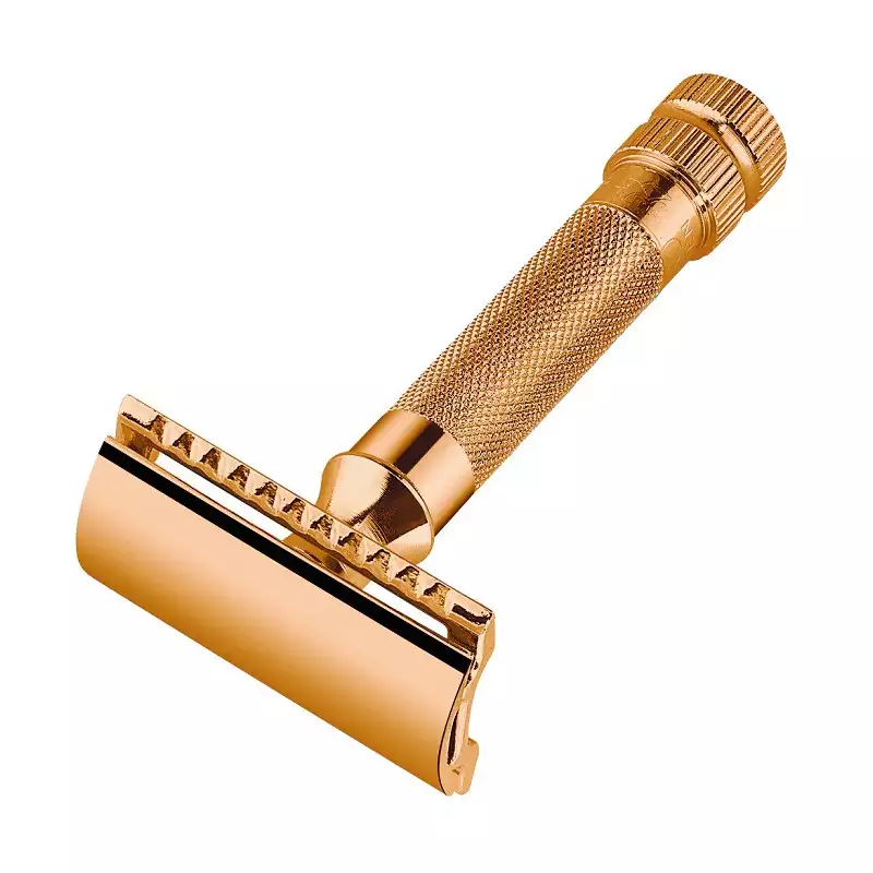 Rasoio di sicurezza Merkur pesante, manico zigrinato lucido, testa cromata con pettine chiuso. Una lametta Merkur in omaggio all’interno.