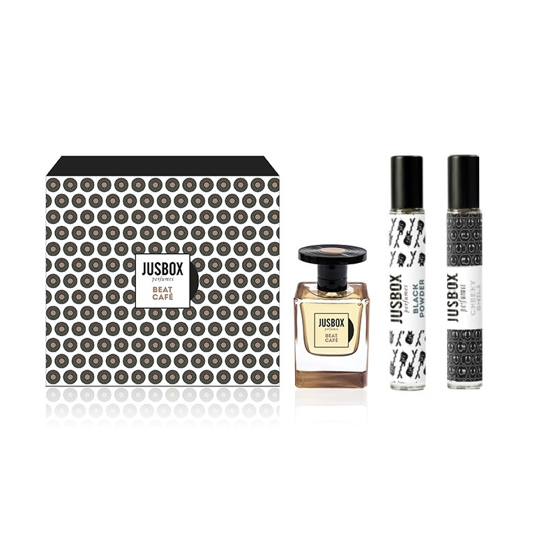 EAU DE PARFUM. Beat Cafè set di Jusbox è un cofanetto con una fragranza creata dal naso Dominique Ropion che trae ispirazione dalle canzoni di Bob Dylan rivolte alla Beat Generation.