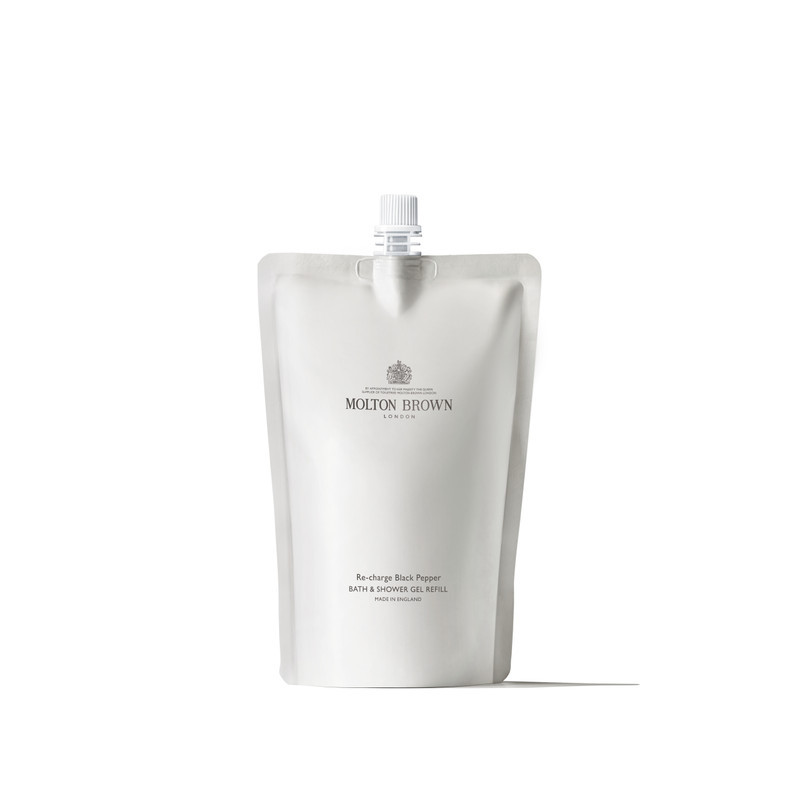 BAGNOSCHIUMA. Black Pepper shower gel refill di Molton Brown a base di olio essenziale di cipresso marino, è un doccia schiuma che lascia sull'epidermide un bell'aroma di note marine.