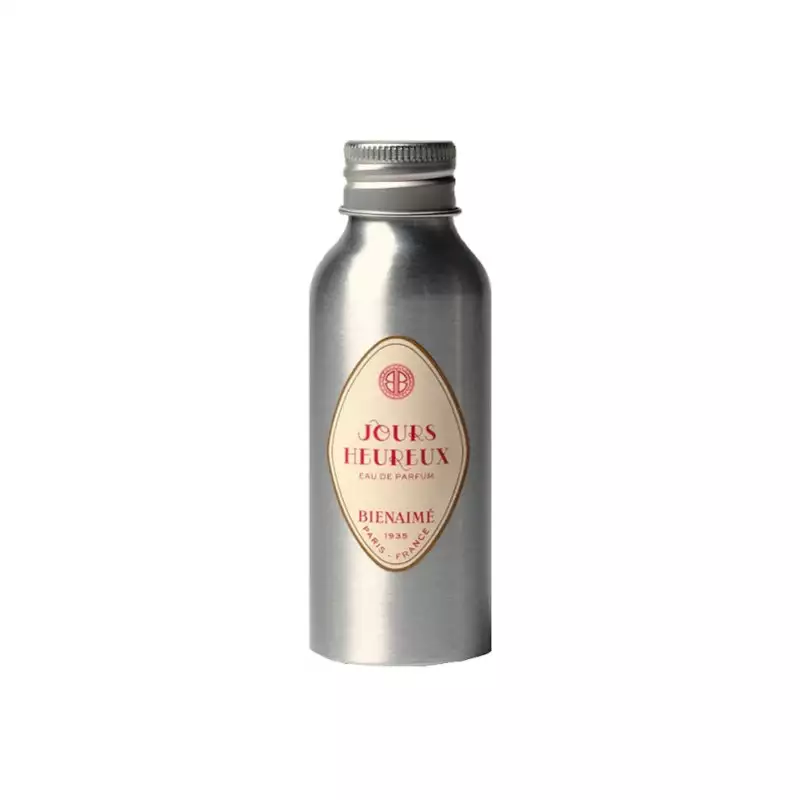 EAU DE PARFUM RICARICA. Jours Heureux di Bienaimè è una fragranza avvolgente e allegra, un inno alla gioia dai sentori talcati e floreali e dallo stile retrò.