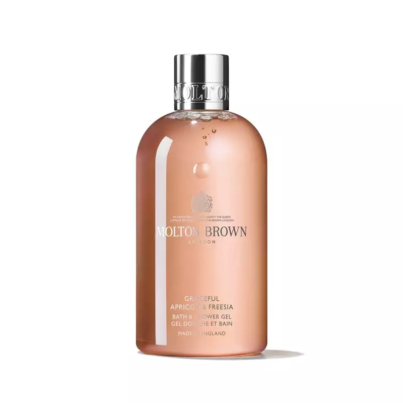 BAGNOSCHIUMA PROFUMATO. Graceful Apricot & Freesia di Molton Brown è un detergente per il corpo con note di albicocca e fresia