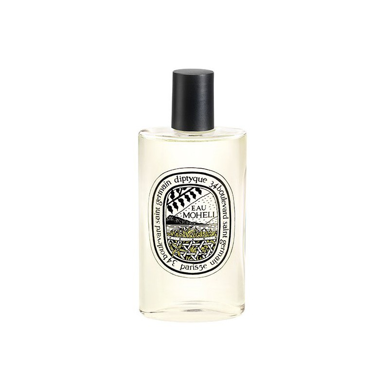 EAU DE TOILETTE. Diptyque, profumiere errante, con il profumo Eau Moheli ha cercato di esprimere il potere e la firma olfattiva dell'ylang-ylang di quest'isola che è nello stesso tempo dolce e dura, triste e gaia, realtà e sogno.