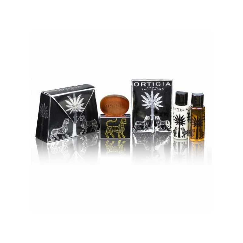 Il regalo ideale: Ambra Nera di Ortigia in scatole argentate colorate; lo stile italiano incontra la storia e magia della Sicilia. 1 sapone 40g, 1 bagno schiuma 75ml, 1 crema corpo 75ml, 1 sali da bagno 75g