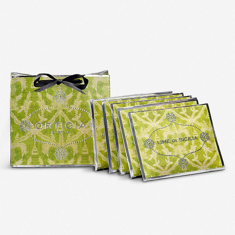 BUSTE PROFUMATE. I sacchetti Lime di Sicilia di Ortigia sono a base di pomice naturale, profumano e si presentano in confezioni lussuose, decorate con rilievi in argento.
