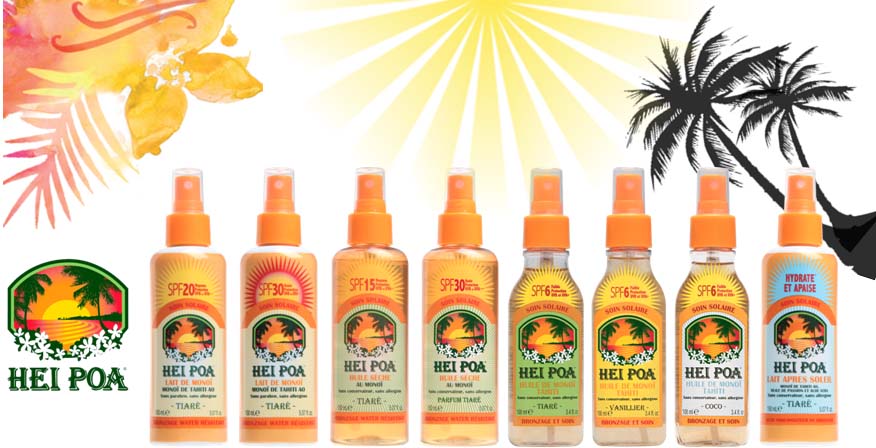 I solari Hei Poa sono senza conservanti, senza allergeni, senza coloranti o oli minerali e uniscono la protezione, al piacere del Monoi di Tahiti. Disponibili in varie texture e protezioni, i solari Hei Poa monoi garantiscono un’abbronzatura sublimata e una pelle delicatamente profumata, anche dopo l’esposizione al sole. Studiati per tutte le pelli, da quelle più scure a quelle più chiare, i solari Hei Poa mettono insieme praticità e comfort.